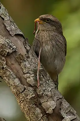 The yellow-billed shrike feeds on insects, which it locates from prominent look-out perches in trees, wires, or posts.[3] They also sometimes eat small frogs, reptiles, and mice, but are not known to eat other birds or to form larders.[4]