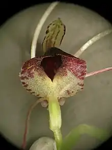 Corybas papillosus dorsal view, showing the slender, acuminate dorsal sepal extending well past the labellum.