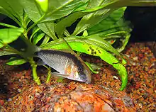 The separation of C. arcuatus and C. granti was only fully clarified in 2019; information published for "C. arcuatus" before this was almost invariably for C. granti.[2] Similarly, the common name skunk corydoras has often been used for C. arcuatus,[1] but the vast majority of skunk corydoras in the aquarium trade are actually C. granti (leading several authorities to transfer the common name skunk corydoras to C. granti).[2][3][4] The two species are very similar and locally they occur together, with both being restricted to the western Amazon basin, but C. granti is more widespread.[2][3][4] In addition to these two, a few other Corydoras species (for example, C. bethanae, C. narcissus and C. urucu) from the western Amazon basin have similar color patterns, as does Brachyrhamdia thayeria; they all have spiny fins with a (to humans) painful but not dangerous venom and their similarity is an example of Müllerian mimicry.[2][5][6]