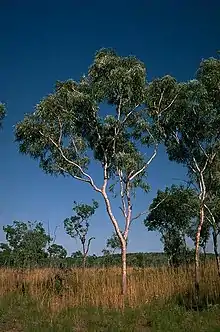 Corymbia collina, commonly known as silver-leaved bloodwood,[2] is a species of tree that is endemic to Western Australia. It has thin patchy rough bark on some or all of the trunk, smooth white to pale grey bark above, lance-shaped to curved adult leaves, flower buds in groups of seven, creamy white flowers and barrel-shaped fruit.