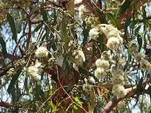Corymbia dallachiana commonly known as Dallachy's ghost gum[2] or Dallachy's gum,[3] is a species of tree that is endemic to Queensland. It has smooth bark, lance-shaped or curved adult leaves, flower buds usually in groups of three, white flowers and cup-shaped, cylindrical or barrel-shaped fruit.