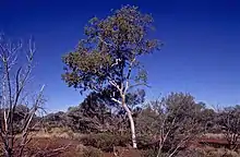 Corymbia ferriticola, commonly known as Pilbara ghost gum,[2] is a species of tree or a mallee that is endemic to Western Australia. It has smooth bark, lance-shaped adult leaves, flower buds in groups of seven, creamy white flowers and shortened spherical to cylindrical fruit.