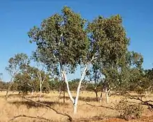 Corymbia flavescens, commonly known as cabbage ghost gum, bastard ghost gum,[2] scraggy cabbage gum, or wrinkle-leaf ghost gum,[3] is a species of tree that is endemic to northern Australia. It has smooth powdery bark, egg-shaped to lance-shaped adult leaves, flower buds in groups of three, white flowers and variably-shaped fruit. The Jaru peoples know it as warlarri.[3]