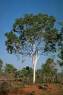 Corymbia grandifolia, commonly known as cabbage gum,[2] large-leaved cabbage gum and paper-fruited bloodwood,[3] is a species of tree that is endemic to northern Australia. It has smooth bark, egg-shaped to broadly elliptic to lance-shaped adult leaves, flowers buds in groups of three or seven, creamy white flowers and cup-shaped to cylindrical fruit.