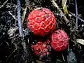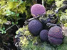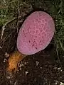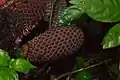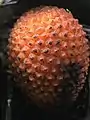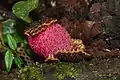 Corynaea crassa is a root hemiparasite of a broad variety of plants, thus requiring no sunlight to gather nutrients and lacking leaves. The vegetative body of the plant, and akin other members of the family Balanophoraceae, consist of an accretion of plant tissue known as a haustorial tuber. It is this haustorial tuber where the inflorescences of the plant develop from. The size of the haustorial tuber is directly correlated to the diameter of the host root from which the tuber derives its nutrients. In addition, the number of inflorescences the tuber produces is directly correlated to the diameter of the tuber itself.[11] The emergence of the inflorescence is seasonal.[8] The individual flowers are pollinated by insects of the orders Hymenoptera and Diptera.[11] The rhizome of C. crassa is irregular in shape, with multiple lobes. It turns a rusty color when dried.[12] The inflorescence is typically pink in color, ranging between a yellowish-brown to an intense purple,[13] with the peduncle, or stalk of the plant, having an irregular short and lobed sheath at its base and having a length of 1.5–2.5 centimetres (0.59–0.98 in).[12] The flower head is globose in shape, tapering to become fusiform in shape.[12] The flower heads have a length of between 2–4 centimetres (0.79–1.57 in) and a diameter of between 1.5–2.0 centimetres (0.59–0.79 in).[12] The individual fruits are obovoid, or egg shape, and around 1.5 millimetres (0.059 in) in length and 1 millimetre (0.039 in) in width.[12]