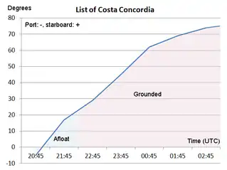 Without propulsive power and no emergency electric power, Costa Concordia moved through inertia and the settings of her rudders,[13] and continued north from Le Scole until well past Giglio Porto. Schettino has said various instruments were not functioning.[14] Reports differ whether the ship listed to port soon after the impact and when she began listing to starboard.[15][16] At 22:10, Costa Concordia turned south. The vessel was then listing to starboard, initially by about 20°, coming to rest by 22:44[17] at Punta Gabbianara in about 20 metres[18] of water at an angle of heel of about 70°. Schettino attributed the final grounding of the ship at Punta Gabbianara to his own effort to manoeuvre it there; in contrast, on 3 February, the chief of the Italian Coast Guard testified that the final grounding of the ship may not have been related to any attempts to manoeuvre the ship[19] and it may have simply drifted in the prevailing winds that night.[20]