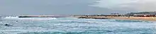 Situated on the occidental coast of the Peninsula of Setúbal, the territory is the result of ocean receding, covering an area of 10.18 km2 between the water and main escarpment. The space is one large beach resulting from progressive decline from the east to the sea. Its coastal extent represents the largest contiguous beach in Portugal, with an expanse of approximately 30 kilometres, from the left margin of the Tagus River to the estuary of Albufeira.[4] Popular in the summer with tourists and local visitors, the beaches have suffered from erosion in recent years; several levels of Portuguese government have taken steps to reduce these patterns, but the erosion has continued at several of the beaches located closest to the mouth of the Tagus.[4]