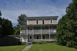 The Cote Apartment House is located on St. Johnsbury's east side, in a small enclave of densely built residential buildings on the west side of Elm Street north of United States Route 2. It is the northernmost of a cluster of multiunit residences organized around a common courtyard, accessed by a lane now called Cote Court, but is visible from Elm Street across a patch of lawn. It is a three-story wood-frame structure, with a flat roof and clapboarded exterior. Its principal visual features are two-story porches, which extend along the front and most of the western side (which faces toward the courtyard. The porches have turned posts with brackets at the top, and square balusters. The main roof has an extended eave adorned with simple scroll-sawn brackets. The building houses three units, each of which retains original woodwork and other features.[2]