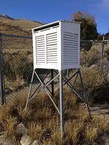 A Stevenson screen or instrument shelter is a shelter or an enclosure used to protect meteorological instruments against precipitation and direct heat radiation from outside sources, while still allowing air to circulate freely around them.[1] It forms part of a standard weather station and holds instruments that may include thermometers (ordinary, maximum/minimum), a hygrometer, a psychrometer, a dewcell, a barometer, and a thermograph.