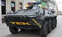 TEK is using a number of small arms weapons most notably the Glock 17/19,[8] USP, the MP5, the 417[8] and the 416, along with less-lethal options such as Beanbag guns and rubber-bullets, Taser x26, OC spray, CS gas, Flashbang and Expandable batons. Detailed information about the equipment of TEK is not public, but according to the Hungarian media, it uses armoured Audi Q7 luxury SUVs[9] and BTR-80 armoured personnel carriers equipped with police light bars on the roof.[10]