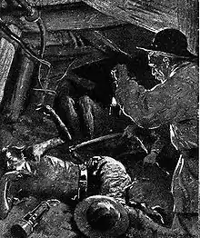The Courrières mine disaster, Europe's worst mining accident, caused the death of 1,099 miners in Northern France on 10 March 1906.[1] This disaster was surpassed only by the Benxihu Colliery accident in China on 26 April 1942, which killed 1,549 miners.[2] A coaldust explosion, the cause of which is not known with certainty, devastated a coal mine operated by the Compagnie des mines de houille de Courrières. Victims lived nearby in the villages of Méricourt (404 people killed), Sallaumines (304 killed), Billy-Montigny (114 people killed), and Noyelles-sous-Lens (102 people killed). The mine was 2 km (1 mi) to the east of Lens, in the Pas-de-Calais département (about 220 km, or 140 miles, north of Paris).[3]