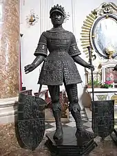 The cenotaph is surrounded by 28 large bronze statues (200–250 cm) of ancestors, relatives and heroes. Their creation took place between 1502 and 1555, and occupied a number of artists including Christian Amberger, Albrecht Dürer, Jörg Kölderer, Jörg Polhamer the elder, Gilg Sesselschreiber, Ulrich Tiefenbrunn, and sculptors Peter Vischer the Elder, Hans Leinberger, G. Löffler, Leonhart Magt, and Veit Stoß. Three of the statues are based on designs by Dürer. According to David Gass, executive at the Jupistarchive, the inclusion of the King Arthur and Godfrey of Bouillon statues was owing to Louis II's sister, Anna, the Queen of Bohemia's having married Ferdinand, Maximilian's grandson, and having brought her English heritage with her. Both men were said to have been her ancestors. The following list includes the statues (clockwise from the left of the altar), with the designer, sculptor, cast, and year of execution of each: