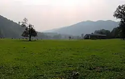 Cove forest is the name for a type of deciduous forest community associated with Appalachian mountain coves. Cove forests, which are unique to the Appalachian Mountains and are a subtype of Appalachian-Blue Ridge forests, are found in protected positions in the landscape at middle to low elevations and are typified by high species richness of both plants and animals.[3] Canopy species in this forest type include American basswood, tulip poplar, sugar maple, red maple, yellow birch, beech, white ash, bigleaf magnolia, bitternut hickory, and eastern hemlock. Carolina silverbell and eastern redbud are important understory trees. Notable flowering shrubs include rhododendron, flame azalea, and mountain laurel.[4] Animals noted for their abundance and diversity in cove forest habitats include salamanders, birds, and small mammals.[3]