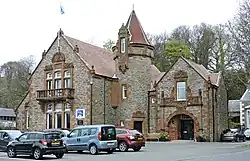 The building was designed by James Chalmers of Glasgow in the Scottish Renaissance style, built in rubble masonry with red sandstone dressings at a cost of £2,300 and was officially opened by the then-provost, Peter Donaldson, on 10 May 1893.[4][5] The design involved an asymmetrical main frontage with four bays facing onto Shore Road. The first bay on the left was formed by a single-storey gabled block; the second bay, which projected forward, was formed by a two-storey gabled block with three segmental windows on the ground floor flanked by brackets supporting a balustraded balcony, and a tri-partite mullioned and transomed window surmounted by an open pediment on the second floor; the third bay was formed by a three-stage circular tower, which featured a tall dormer window in the third stage and was surmounted by a conical roof; the fourth bay was formed by a two-storey gabled block with a wide arched entrance, which was encircled by ornate voussoirs and surmounted by a carved coat of arms, on the ground floor, with a sash window surrounded by an architrave on the first floor.[1] Internally, the principal rooms were the main assembly hall, which could accommodate about 130 people, and the library.[6]