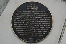The Coventry Theatre was a 2,000-seat theatre located on Hales Street in Coventry, England. It opened in 1937 as the New Hippodrome and was renamed the Coventry Theatre in 1955. In 1979 it was purchased by businessman Paul Gregg and became the Coventry Apollo. It closed in 1985 with a performance by Barbara Dickson. In its later years the building became a bingo club before being demolished in 2002.[1]