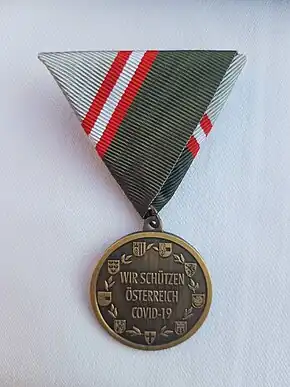 The Covid-19 Commemorative Medal (German: Covid-Erinnerungsmedaille) is a state award of the Republic of Austria, established on July 1, 2020. The award is presented by the Federal Ministry of Defence to both soldier and civilian members of the Austrian Armed Forces. The medal recognizes those military service members who have supported operations in the fight against the COVID-19 pandemic.[2]