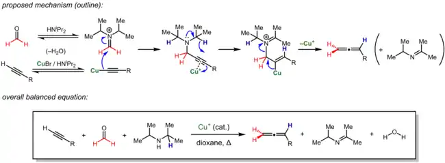 The Crabbé reaction (or Crabbé allene synthesis, Crabbé–Ma allene synthesis) is an organic reaction that converts a terminal alkyne and aldehyde (or, sometimes, a ketone) into an allene in the presence of a soft Lewis acid catalyst (or stoichiometric promoter) and secondary amine.[1][2] Given continued developments in scope and generality, it is a convenient and increasingly important method for the preparation of allenes, a class of compounds often viewed as exotic and synthetically challenging to access.