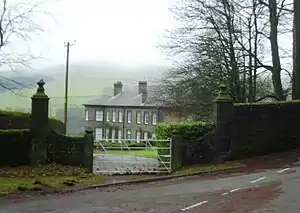 It was built in 1815 by George Palfreyman, the owner of a textile printing works nearby. It has since been extended by the addition of large curved bow windows at each end of the entrance front.[1] The house is constructed in brick-sized blocks of brown sandstone, with ashlar quoins and dressings. It is roofed in slate. The house is in two storeys.[2] The entrance front has five bays.[3] In the centre is a raised portico with four Ionic columns. It is approached from each side by a flight of steps. Its base is rusticated and contains three arched recesses.[2] Above the portico is a window with an entablature. About the house, Figueirdo and Treuherz comment that "it has an imposing air of millstone grit solidity".[1] The house is recorded in the National Heritage List for England as a designated Grade II* listed building.[2] Associated with the house are three structures listed at Grade II: the gateway with its wing walls,[4] the retaining wall to the garden terrace,[5] and a wall and summer house in the garden.[6]