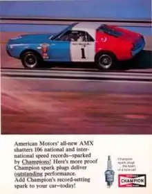 Two cars were prepared for the endurance speed runs on a five-mile banked track in Texas.[15] The shattered records included a Class C AMX (the No. 2 Lee Breedlove car) with the standard 290 cu in (4.8 L) AMC V8 engine (bored to 304 cubic inches) with a 4-speed manual transmission, achieving a 24-hour average of 140.79 mph (226.58 km/h) that was set by Craig and his wife Lee. New records in a Class B AMX (the No. 1 Craig Breedlove car) using the optional 390 cu in (6.4 L) "AMX" V8 (397 cubic inches) with a 3-speed automatic transmission, that included a 75-mile (121 km) distance with a flying start at 174.295 mph (280.501 km/h), as well as a 173.044 mph (278.487 km/h) over a 100-mile (161 km) distance from a standing start.[16]