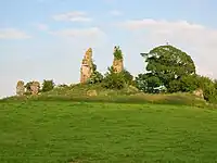 The ruins stand upon a knoll rising out of a plateau, between what appears to have been two marshes or lochans, and the ditches were originally cut between them. One ditch cuts the ridge 117m NE of the castle to form an outer bailey. The castle would have been effectively isolated from the 'mainland', and a significant barrier raised by the water to any potential besiegers at the period when the use of gunpowder was unknown. Two crumbling gables, portions of walls, and shreds of battlements remain, and in the 19th century several underground vaulted chambers survived, although partly filled with rubbish, and home to foxes and bats.[14] The entrance to the castle was at the south-west side by a drawbridge,[15] of which the abutment still survives.[16] The entrance pend or arched passage had a circular watch-tower or bastion to defend it. Within the closing wall was a courtyard surrounded by buildings, and from this courtyard there was an entrance into the great hall, long blocked up.[17]
