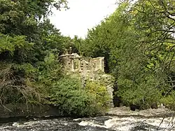 Upstream from the bridge is a grotto and bath house, built in a similar rustic style and presumably by the same architect. The bath house is a square vaulted chamber, with a plunge pool fed by river water. The upper chamber comprises a circular saloon with windows, although this is now roofless and in poor condition. The original roof was a conical thatched structure, and a niche on the exterior wall may have housed a statue.[20][21]