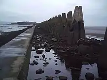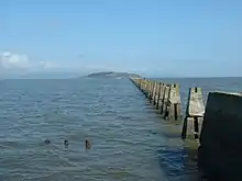 Cramond Island is a tidal island about one mile (1.6 km) out to sea, which is connected to the mainland at low tide across the Drum Sands. A paved path, exposed at low water, allows easy access. This causeway runs at the foot of a row of concrete pylons on one side of the causeway, which were constructed as an anti-boat boom during the Second World War and are one of the most striking sights in the area. At high tide the path is covered by several feet of seawater which cuts the island off from the mainland. It is safe to walk along the raised causeway to the island at low tide, but only if visitors ensure that they leave enough time to return to the mainland before the water rises. The speed at which the tide comes in can easily trap the unwary. A large signpost (located at the start of the causeway) warns visitors of the danger.[3] If this warning is ignored, there can be serious accidents[4] or people may be stranded on the island until the next low tide.[5][6][7] In 2011, a Daniel Defoe of Livingston, West Lothian and an unidentified female found themselves trapped on the island due to miscalculating the times of the tide. This story gained attention due to the ironic parallels with Robinson Crusoe; a novel written by Daniel Defoe published in 1719.[8] Coastguards recommend that the crossing is only attempted during the two hours either side of low water. On the RNLI (Royal National Lifeboat Institute) Queensferry website, there is a list of “safe crossing times” and it states that the “times are given as a guide and may change due to weather and conditions. Times listed in BLACK are the first safe crossing time and those listed in RED are when to be back on the mainland”.[9]