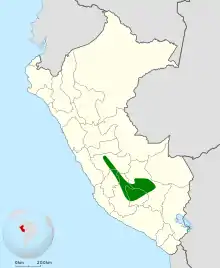 Subspecies C. a. albigula of the creamy-crested spinetail is the more northerly of the two. It is found in the Andes of central Peru from the Department of Junín south to Ayacucho and Apurímac departments. The nominate subspecies is found in the Andes of southern Peru in the departments of Cuzco, Ayacucho, and Apurímac. The species inhabits semi-humid and humid montane forest and woodlands. It also occurs in cloudforest and Polylepis woodlands. In elevation it mostly ranges between 2,400 and 3,650 m (7,900 and 12,000 ft) but is found as high as 4,240 m (13,900 ft).[3]