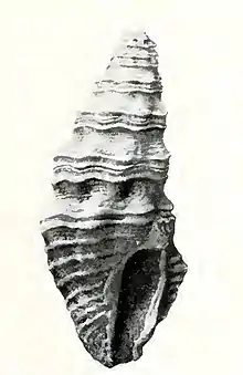 (Original description) The small shell is solid and grayish (this shell, being somewhat bleached, is probably of a darker color when fresh). It contains six whorls exclusive of the (lost) protoconch. The suture is strongly appressed, obscure with a thread-like edge in front of which is a narrow spirally striated space bordered in front by a larger cord forming the posterior margin of the anal fasciole. The fasciole is strongly constricted, undulated by the ribs and spirally striated. Other spiral sculpture consists of (on the upper whorls one, on the later two) peripheral cords which are swollen where they pass over the ribs and on the anterior of which the suture is laid. On the body whorl there are six such cords with much wider spirally striated interspaces, and about five closer threads on the siphonal canal . The axial sculpture consists of (on the body whorl six) strong rounded ribs almost continuous up the spire, most prominent at the periphery and feeble on the base. The aperture is narrow, with a varicose rib behind it. The anal sulcus is short, with a strong subsutural callus. The inner lip is erased. The columella shows a thin layer of callus, smooth, short, with a very short deep siphonal canal forming an evident siphonal fasciole.[2]