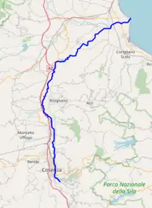 The Crati rises in the central Sila Mountains in the comune Aprigliano. It starts at as the Craticello at an elevation of 1,742 meters. It descends very steeply northward towards Cosenza where it is joined on the left by the Busento river, doubling in size. From here on it flows through a large plain, the Vallo del Crati. Here it is joined by several tributaries from the right: the Arente, Mucone (its main tributary on the right) and Duglia rivers. Several smaller streams also join it on the right: the Finita, Turbolo, Cucchiato, Campagnano, Mavigliano and Settimo. The river is also joined by several left tributaries including the Annea. It has a drainage basin of 2,448 square kilometres (945 sq mi).[2]