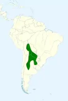 The cream-backed woodpecker is found from north-central Bolivia and western and central Paraguay east and south to north central Argentina, northern Uruguay, and southeastern Brazil's Rio Grande do Sul. It inhabits the generally open landscapes of the dry Gran Chaco including savanna, woodlands, transitional forest, pastures with copses of trees, and palm groves. In elevation it ranges up to 2,500 m (8,200 ft).[4]