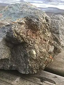 An important geological unit within the SIC is the Sudbury Breccia, which is an impactite interpreted to have been formed during the impact crater modification or excavation.[1] Copper, nickel, and PGE rich sulfides settled to the base of the molten Sudbury Breccia, and formed veins and stockworks of mineralization in the footwall (the non-igneous rocks underlying the SIC).[1][9] Pre-existing weaknesses in the footwall play a crucial role in the distribution of these sulfide-rich structures. [1] This results in a spatial association between the sulfide-rich ore deposit locations and the lithological contact between the footwall and the Sudbury Breccia. [1] The contact between the SIC and the footwall is marked by "broad haloes of metalliferous hydrous silicate minerals",[1] thought to be created by the early process of magmatic-hydrothermal fluid alteration and the late process of metamorphic fluid alteration.[1]