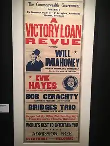 Then in 1943, the management was taken over by Will Mahoney[24] and his wife, American entertainer Evie Hayes,[25] together with American businessman Bob Geraghty.[26] During World War II the Cremorne became a popular entertainment venue for Australian and American servicemen on leave. Mahoney and Hayes appeared on stage regularly along with leading artists like comedian Roy Rene,[27] actor and comedian George Wallace,[28] actor, stuntman and circus performer Jim Gerald,[29] singer Olga Vernon, comedian Buster Fiddess,[30] vaudevillian Peggy Mortimer,[31] actor and entertainer Morry Barling,[32] Ron[33] and Iris Shand – both were actors and versatile stage performers, and chatting cartoonist "Inky" Williams.[34] Peggy Mortimer also appeared under her married name, Peggy Toppano, and was invited to perform at the Cremorne Theatre by Bob Geraghty.[35]