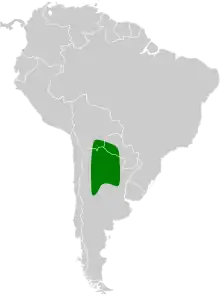 The crested hornero is found from extreme southeastern Bolivia and western Paraguay south into Argentina as far as the central provinces of San Luis, Córdoba, Santa Fe, and Entre Ríos. It inhabits several arid landscapes including lowland scrublands, higher elevation Gran Chaco scrub, and woodlands. It occurs as high as 1,000 m (3,300 ft).[3]