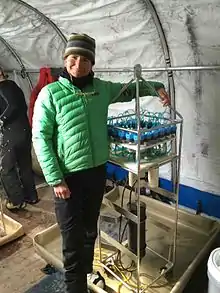 Takacs-Vesbach's contributions to Antarctic science have been in the field of microbial ecology.[5] Until her doctoral research on bacterioplankton biomass and productivity in the lakes of the McMurdo Dry Valleys, Antarctica, bacterioplankton were considered unimportant. She used a forward difference model to show that not only are bacteria significant to the biomass of these lakes, but that substantial predation occurs every season to reduce bacterial biomass by up to 88% at the height of the growing season. Further work by Takacs-Vesbach in this system included estimates of bacterioplankton organic carbon demand and respiration rates. Takacs-Vesbach also contributed to the description of the first microbiological study of sub-glacial Lake Vostok. Along with her colleagues, Takacs-Vesbach reported the presence and activity of bacteria associated with the accretion ice >4 km below the surface of the Antarctic polar plateau. This provided evidence that life may exist in inhospitable settings, which opened the possibility that other planetary bodies, such as Europa or Enceladus, may harbor life today.[6] It is only in the past few years that Lake Vostok and other similar subglacial lakes finally have been sampled, confirming the initial findings of Takacs-Vesbach and her colleagues that life can exist in the deep icy subsurface of Antarctica.[6][7]