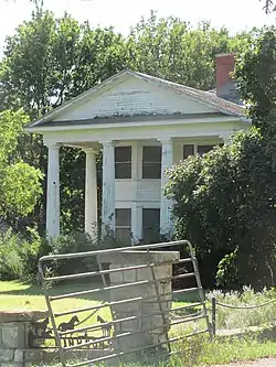 The east-facing main house has an "impressive L-shaped Doric portico [which] is the dominating feature of the ranch." The house originally had an L-shaped veranda and a round tower with a spire; the veranda was replaced by the Doric portico and the formerly circular corner now has octagonal edges. It has a two-story main section with a high hipped roof, a two-story wing to the south and a one-story wing to the north.[2]