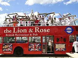 The Crocketteers during the 2010 World Cup Final on The Lion & Rose English Double Decker Bus.