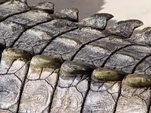 Crocodile leather is the processed hide of one of 23 crocodile species in the world.[1] Crocodile leather is an exotic leather which as a group, makes up less than 1% of the world's leather production.[2] It is rare compared to other hides such as sheep or cow and requires high levels of craftsmanship to prepare it for use in the consumer industry.[3] Crocodile leather is considered a luxury item utilized by high fashion brands such as Hermes, Moet Hennessy Louis Vuitton (LVMH) and Gucci.[4] As a material, crocodile leather is rare and expensive because of limited numbers of crocodiles, their relatively small size and the scarcity of dependable farms and tanning facilities to process and prepare the product for market.[4]