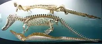The epidermal scutes of the alligator consists of oblong horny scales, arranged in transverse rows; the long axes of the scales are parallel to that of the body. On the tail, except along the mid-dorsal line, and on the ventral side of the trunk and head these scales are very regular in outline and arrangement; on the sides of the head and trunk and on the legs they are much smaller and less regularly arranged, while along the mid-dorsal line of the tail, especially in its posterior half, they are elevated into tall keels that give the tail a large surface area for swimming. The first three digits of both manus (fore foot) and pes (hind foot) are armed with horny claws, which also belong to the epidermal part of the exoskeleton.