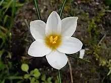 Growing to 10 cm (3.9 in), this cormous perennial produces white flowers with a yellow throat in early spring. In cultivation, it has gained the Royal Horticultural Society's Award of Garden Merit.[2]