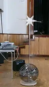 The Croix Sonore is an early electronic musical instrument with continuous pitch, similar to the theremin. Like the theremin, the pitch of the tone is dependent on the nearness of the player's arm to an antenna; unlike the theremin, the antenna was in the shape of a cross, and the electronics were inside a brass ball to which the cross was affixed.[1]