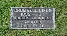 Interment was made in the Green Lawn Cemetery, at Dixon's hometown of Columbus, Ohio. His epitaph reads "Cromwell Dixon, World's Youngest Aviator, Loved By All."
