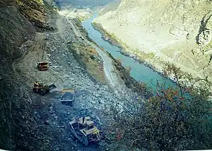 Work during the dam's early construction phase in 1982 identified numerous faults and shear zones beneath the dam – in particular, the River Channel Fault.[14][76] Despite considerable amounts of concrete being pumped into tunnels across the fault to act as shear pins,[76] the faults posed a significant risk and forced a redesign of the dam leading to the incorporation of a controversial slip joint. The slip joint is designed to accommodate up to 2 m (6.6 ft) of lateral fault movement and 1 m (3.3 ft) of vertical movement.[39][76] Geologists at the time considered there was a low to very-low possibility of movement along the Dunstan Fault upstream of the dam in the event of a major earthquake; such a movement could lead to up to 200 mm (7.9 in) of relative movement on the River Channel Fault at the dam site.[39]