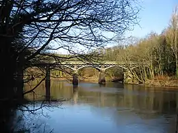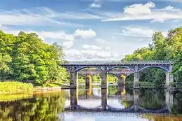 The Crook o' Lune is crossed by two viaducts built to carry the "Little" North Western Railway over the river. The West Viaduct has six spans and the East Viaduct five; both are now Grade II listed buildings. Built in 1849, probably to designs by Edmund Sharpe, they originally carried only one track but were modified in 1882 when a second track was added to the line.[4] The railway was closed in 1967 as part of the Beeching cuts, and has since been converted into a long-distance footpath and cycleway. The West Viaduct underwent a major repair and refurbishment in 2005,[13] and the East Viaduct in 2013.[14]