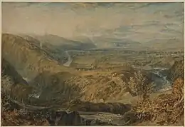 Around 1817 or 1818 J. M. W. Turner produced his watercolour Crook of Lune, looking towards Hornby Castle, capturing a view seen from the same "station" that Gray had used in the previous century but altering the topography of the scene for artistic effect.[25][31] It has been called "one of the grandest and loveliest panoramas that Turner ever created".[32] An engraving of it was taken by John Wykeham Archer and published in Thomas Dunham Whitaker's History of Richmondshire.[33]