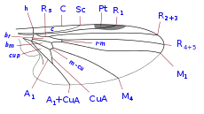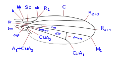 - costa (C), the subcosta (Sc), the radius (R), the media (M), the cubitus (Cu), and the anal vein (A). There has been much disagreement concerning the homologies of the veins posterior to the subcosta in the Diptera and some authors simply number the longitudinal veins from the front to the rear. In addition to the longitudinal veins there are three principal transverse veins, usually called crossveins. These are the inner or anterior crossvein, the posterior or discal crossvein, and the anal crossvein. The principal cells of the wing used in classification are the discal, anal and second basal cells.