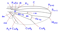 The system of venation is simplified but is representative of the Comstock–Needham system, which was conceived in the late nineteenth century to define precisely the terminology of the wing morphology of insects. In Diptera are the wing-veins are costa, subcosta, radial, medial and cubital. In addition, there are two anal veins, of which the second, also called the axillary, separates the anal region from the alula. The details of the wing veins, the transverse veins and the shape of the cells, are important characteristics for determining taxonomic groups including at species level.