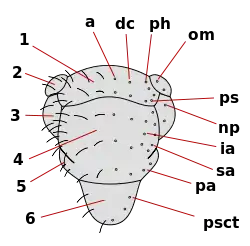 Chaetotaxy (bristles): a: acrostical; dc: dorsocentral; ph: posthumeral; om: humeral; ps: presutural; np: notopleural; ia: intralar (postsutural); sa: supralar (postsutural); pa: postalar; psct: scutellar. McAlpine terminology vs. other terminology Equivalents are:– postpronotum = humeral callus or humerus; anepisternum = mesopleuron; proepisternum = propleuron; proepimeron = no equivalent; anepimeron = pteropleuron; katepisternum = sternopleuron; katepimeron = no equivalent; meron = hypopleuron; greater ampulla = no equivalent; laterotergite = no equivalent; mediotergite = no equivalent; postpronotum = humeral callus or humerus; anepisternum = mesopleuron; proepisternum = propleuron; proepimeron = no equivalent; anepimeron = pteropleuron; katepisternum = sternopleuron; katepimeron = no equivalent; meron = hypopleuron; greater ampulla = no equivalent; laterotergite = no equivalent; mediotergite = no equivalent | |