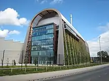 An area north of Pontefract Lane formerly housed the main Leeds wholesale markets, one for meat, one for fish, fruit and vegetables.[1] This was redeveloped into a facility for converting household waste into energy which opened in April 2016, and handles all the black bag bin waste from Leeds.[2] This is called the Leeds Recycling and Energy Recovery Facility (RERF), and is operated by Veolia. The main building itself is distinctive in appearance, because of its arched timber beam construction and a Green wall on the South side, and won the Project of the Year award at the Structural Timber Awards 2015.[3][4]