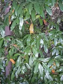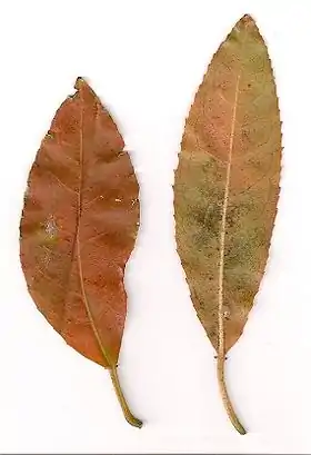 Leaves alternate, blunted tipped, tapering or rounded at the base. Glossy green above, somewhat duller below. An occasional orange senescent leaf will be seen in the canopy. Leaves 5 to 12 cm long, elliptic in shape, toothed or sometimes not toothed. Leaf stalks 5 to 13 mm long, channeled on the upper surface. At the top of the leaf stalks are two small glands.
