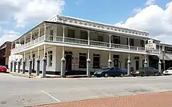 The Crown Hotel, formerly the Lakeside Hotel is a historic hotel building at 119 West University Street in Siloam Springs, Arkansas. It is a two-story brick building in an L shape, with a hip roof topped by a low cupola. It is distinguished by the brickwork at the roofline, and by the delicately spindled two-story porch that wraps around two sides of the building. Built in 1881, just one year after the city's founding, it is one of the city's oldest commercial buildings, and may have been its first brick hotel.[2]